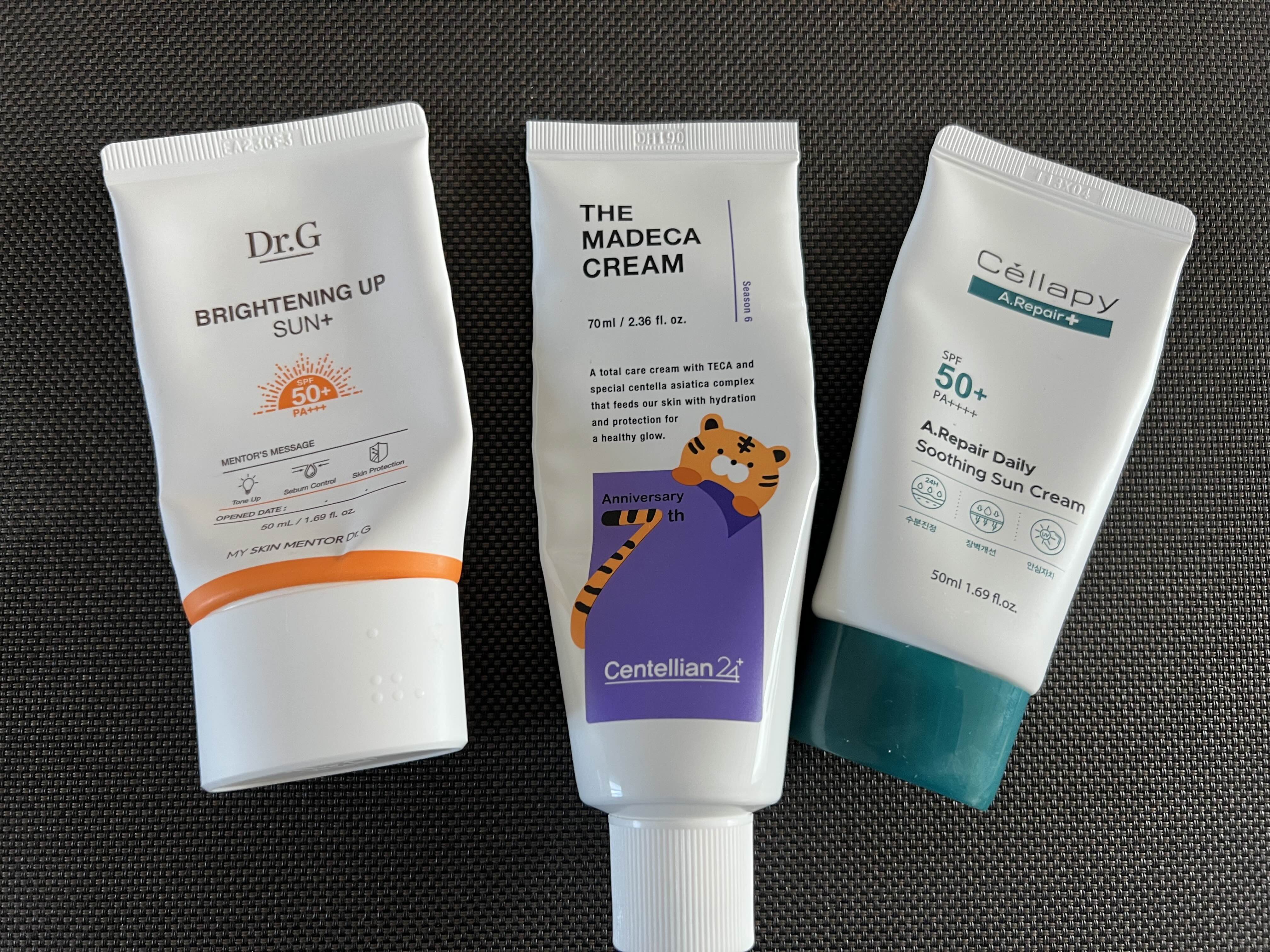 닥터지 브라이트닝 업 선크림, 마데카 크림, 셀라비 리페어 데일리 수딩 선크림이다.