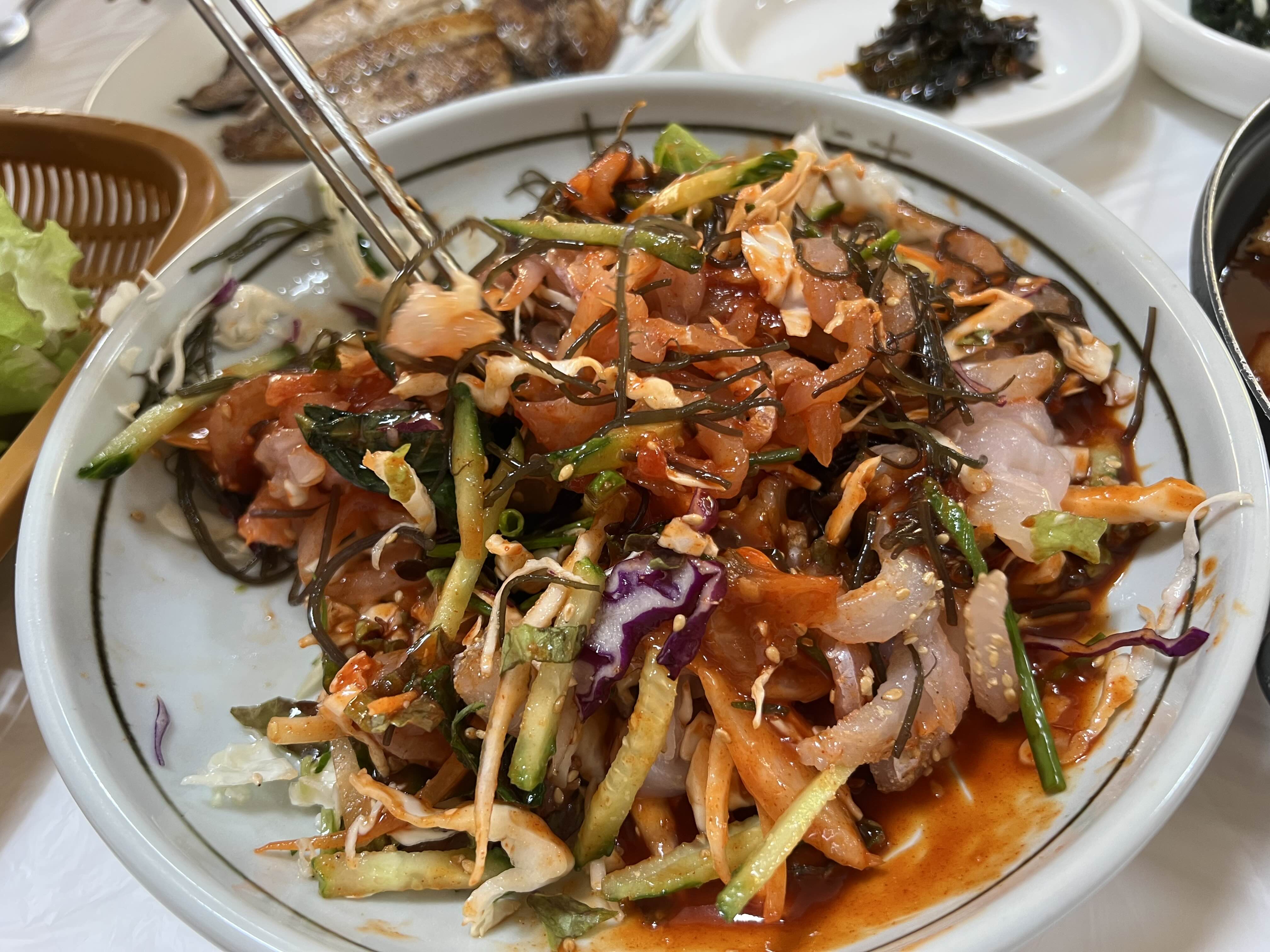 덜어서 밥과 함께 비벼 먹어도 맛있고, 따로 반찬처럼 먹어도 어우러진다. 가자미회가 정말 일품이다.