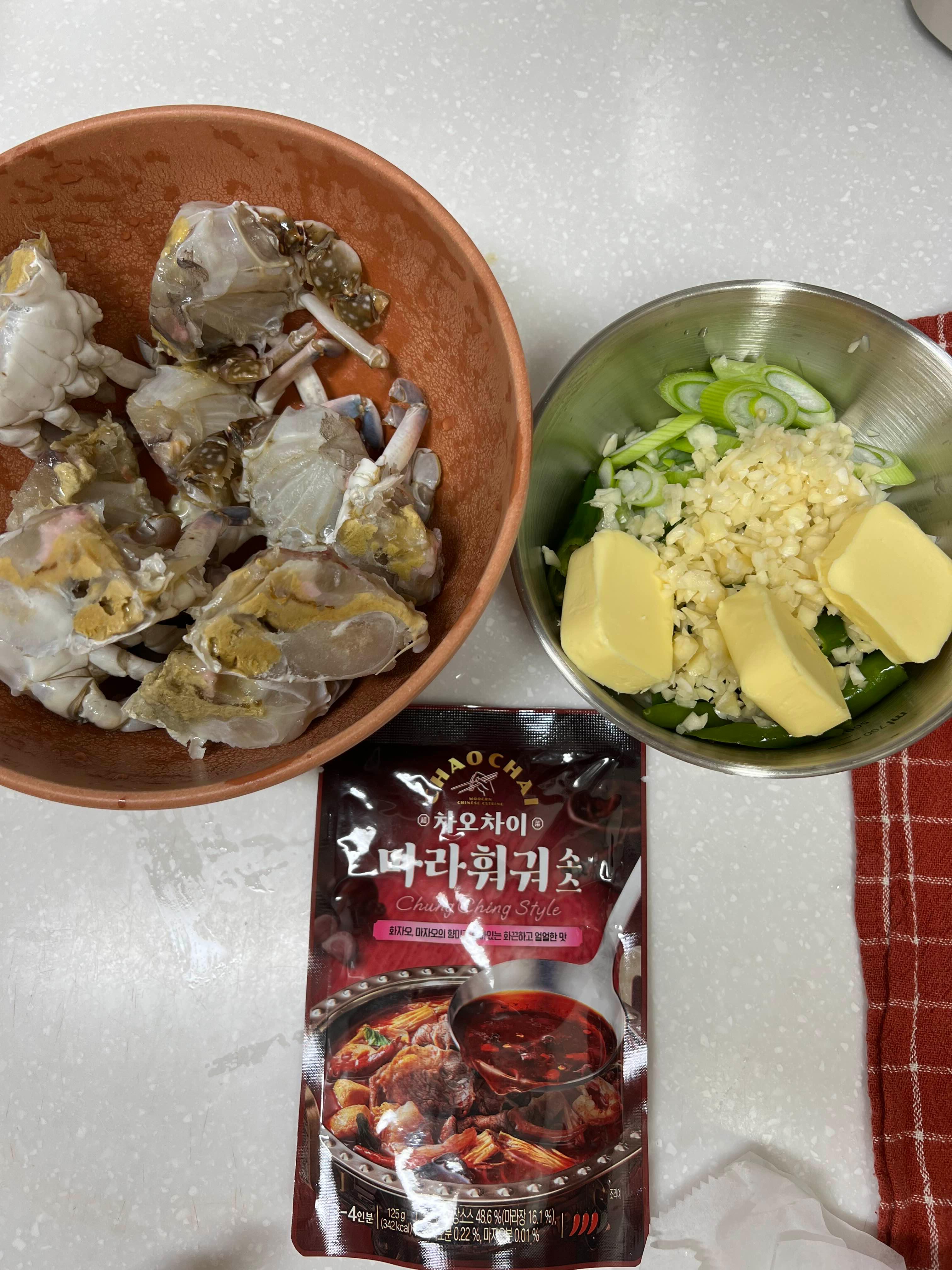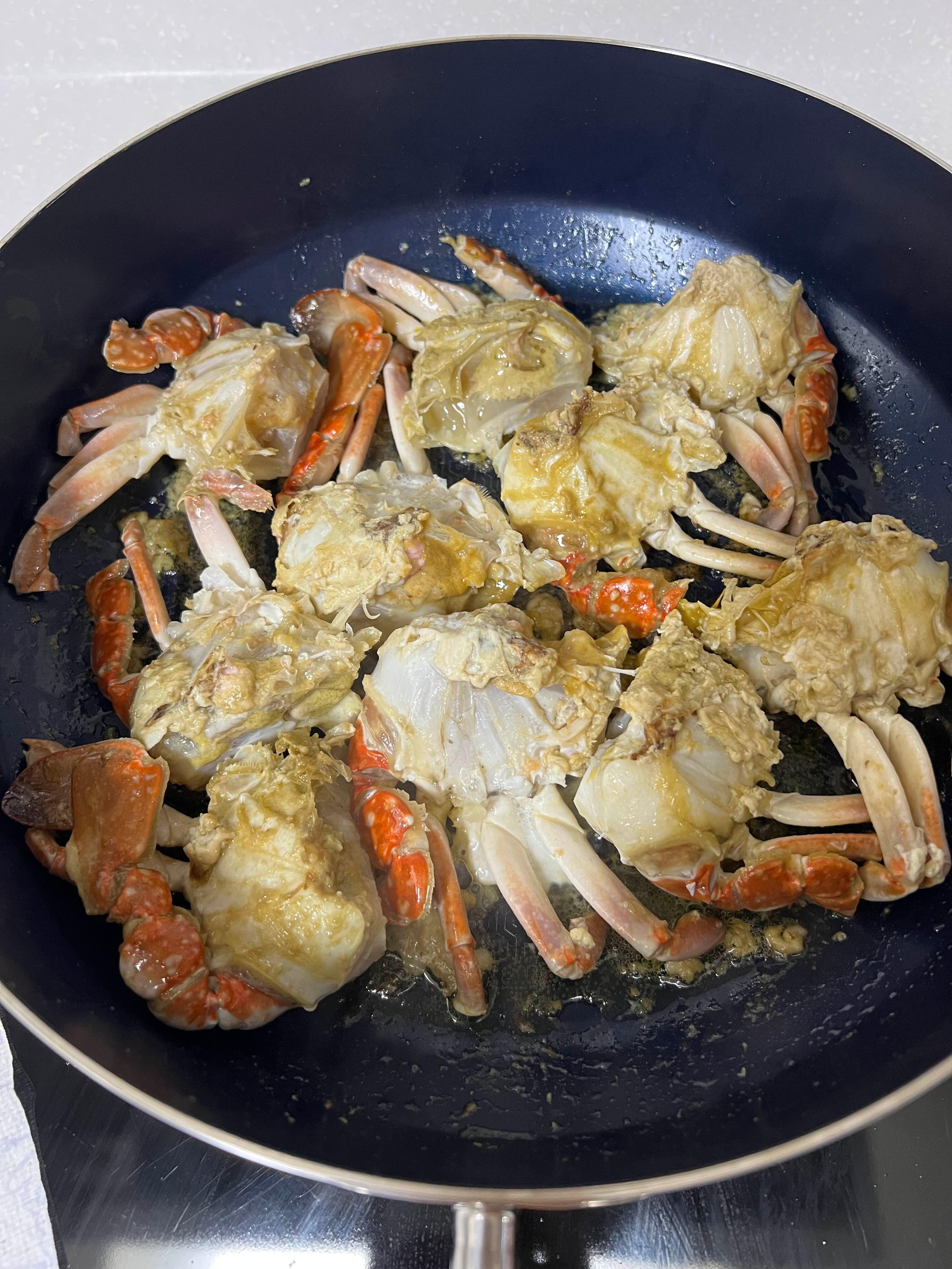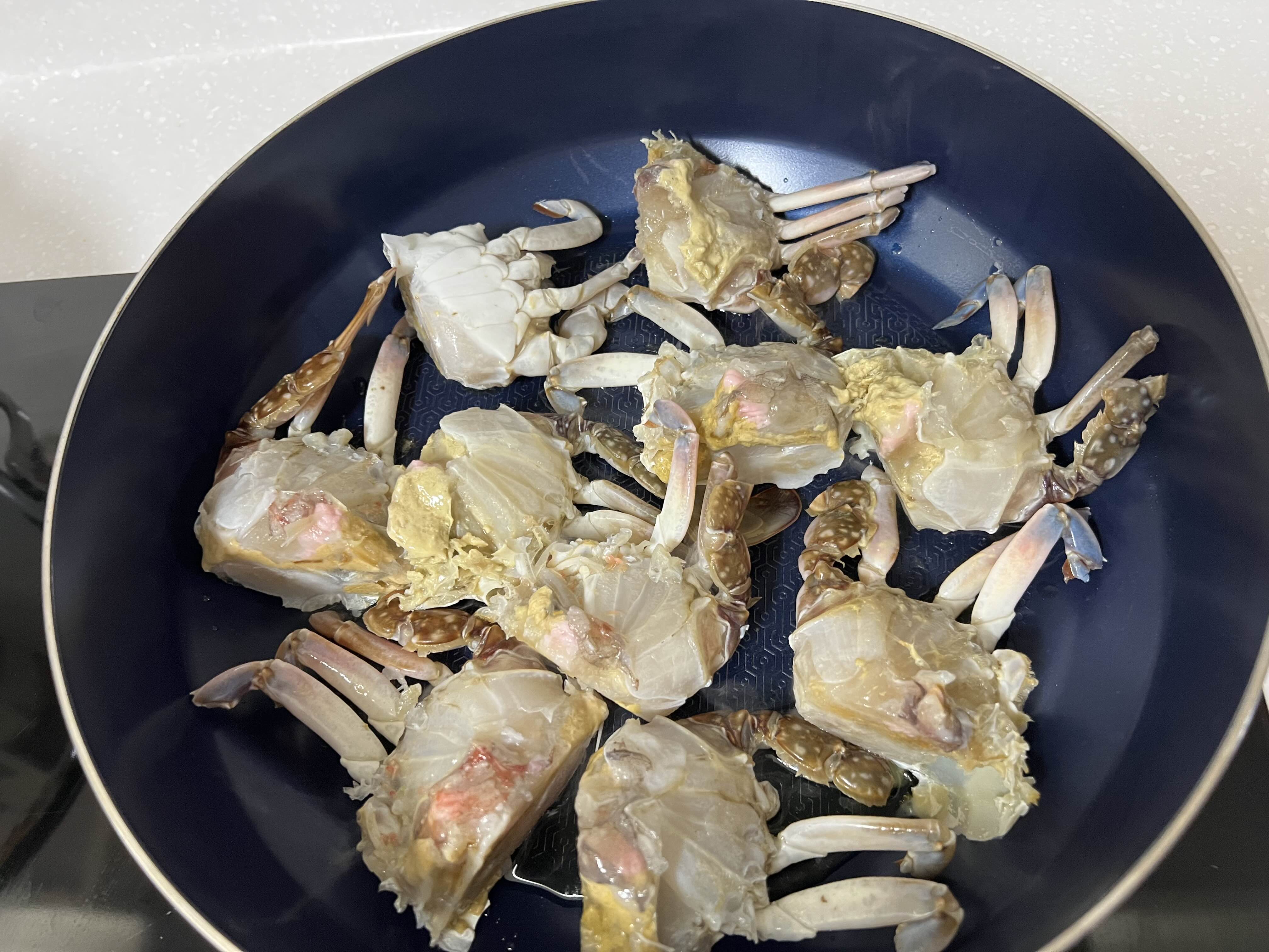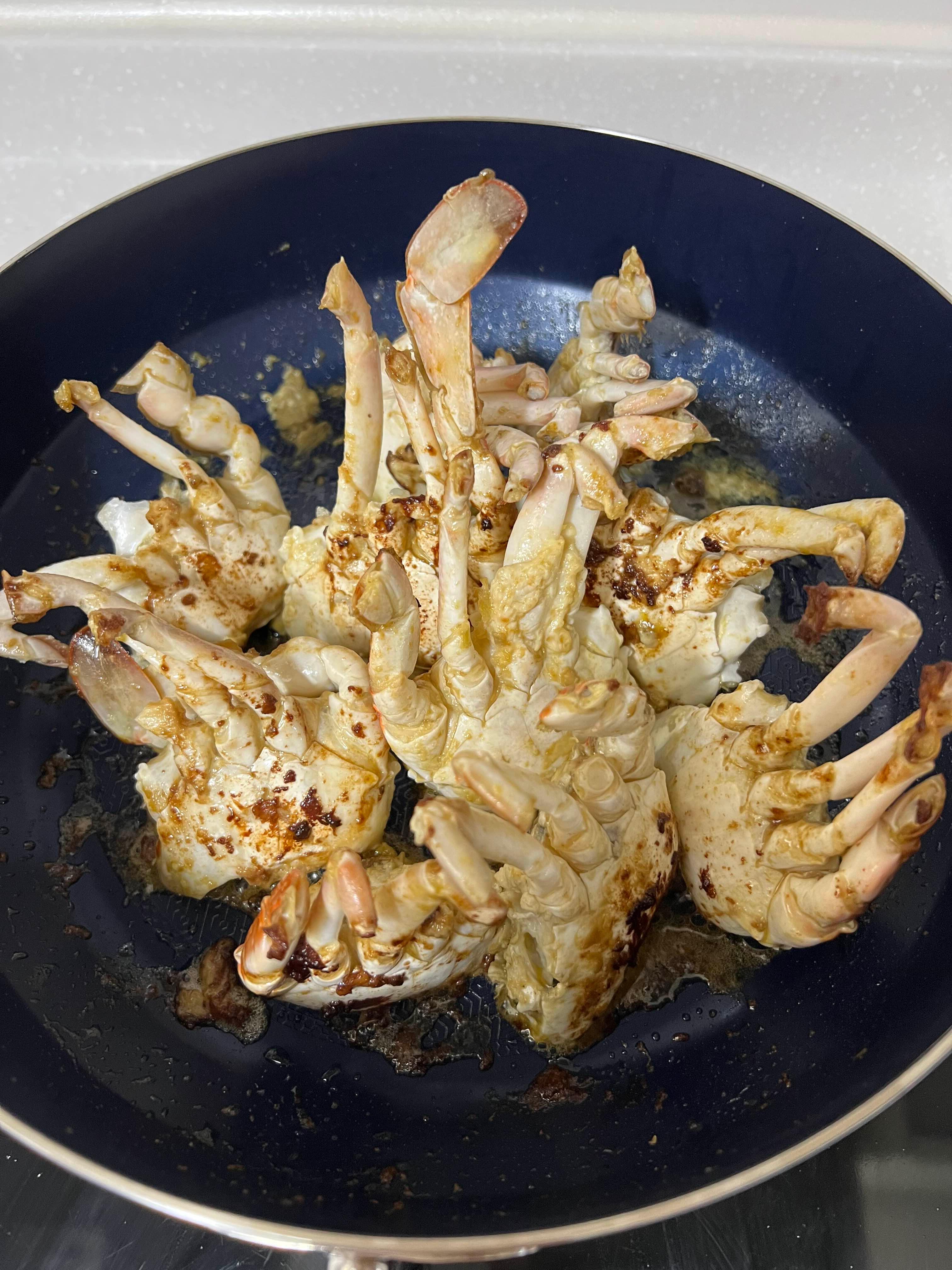 냉동실에서 꺼내 (겨울 기준) 1시간 정도 실온에 둔 게를 기름 두르고 굽는다