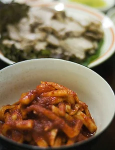 이 음식을 뭐라고 부르는 지 모르겠지만, 아무튼 자작하게 끓인 고소하고 매콤한 된장 찌개가 먹고 싶어서 끓였다. 깡장: 또는 깡된장이라고도 한단다. 된장을 야채 등과 고추가루 등으로 양념해서 자작하게 끓여서 졸인 것. 오징어 돼지고기(일단 삼겹살로 했는데 김치찌개도 그렇고 삼겹살이 들어가면 느끼해서, 다음 부턴 앞다리살로 해야겠다. 청주, 후추 좀 넣고 10분 정도는 미리 간함) 이 둘 섞어 고추장, 된장, 고추가루 1.5 큰술 넣어 참기름 두른 뚝배기에 볶다가, 멸치육수 1~2 컵 넣고 끓임. 그리고 항상 된장찌개건 김치찌개건 마무리는 갖은 양념.(다진마늘, 청주 조금, 파, 고추) 먹다보니, 오징어가 이렇게 된장하고 잘 맞는 것이었던지!