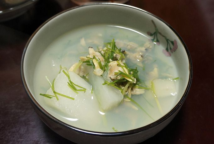 바지락살이 있어서 무, 바지락살, 부추를 듬뿍 넣고 끓였다.