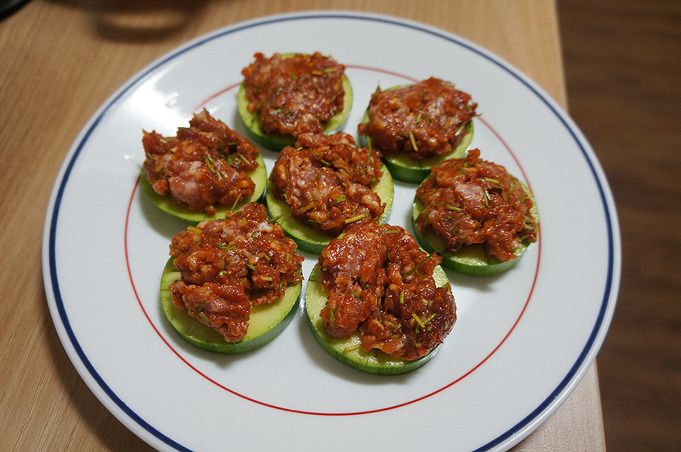 위에서 만든 돼지고기소를 가지에 넣고 찐, 이북식 가지찜.