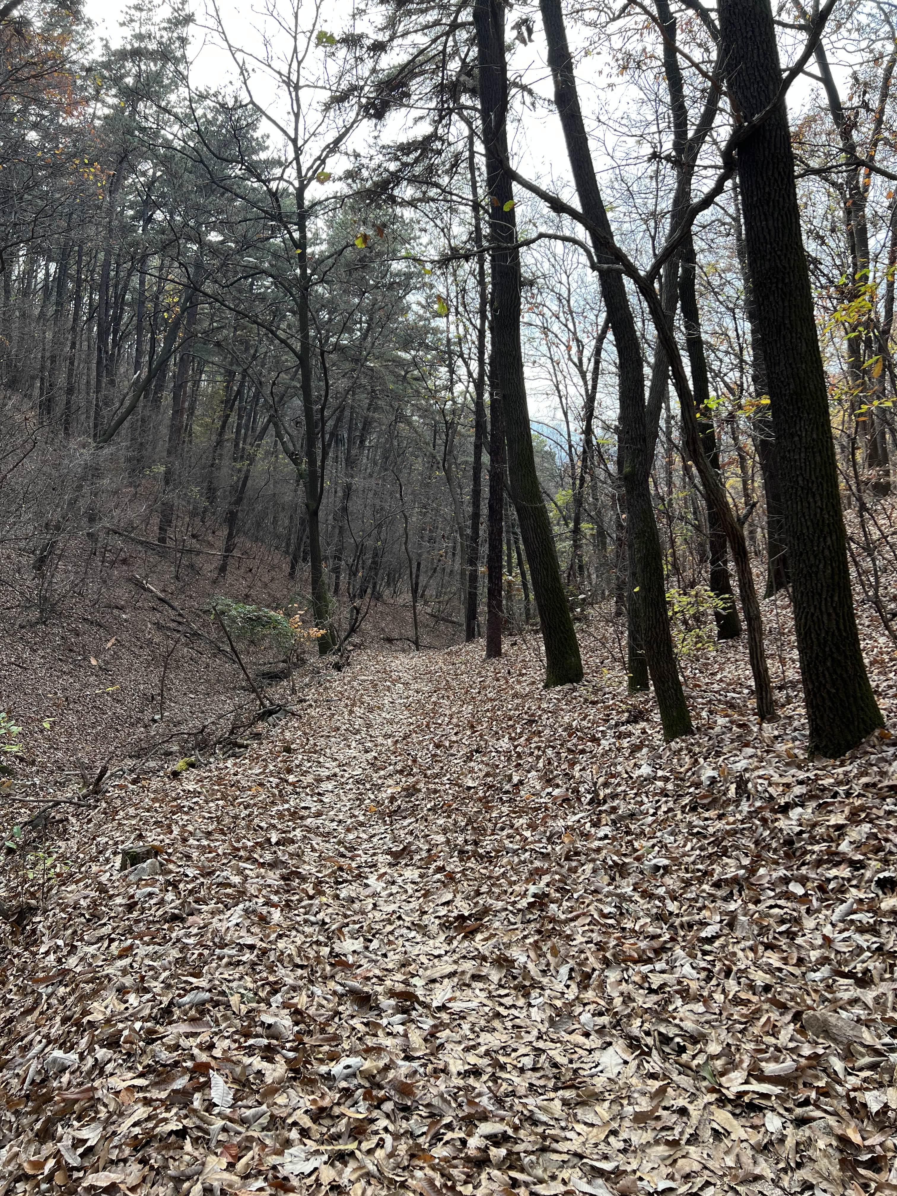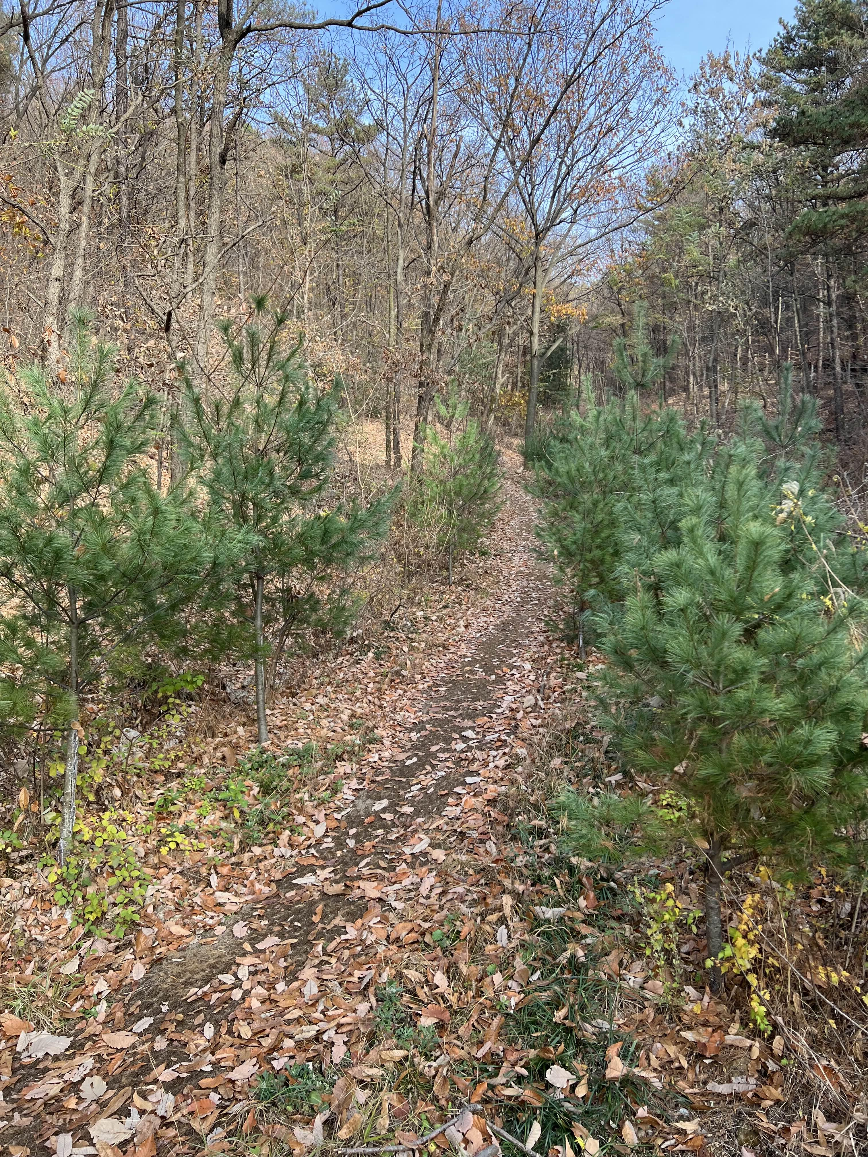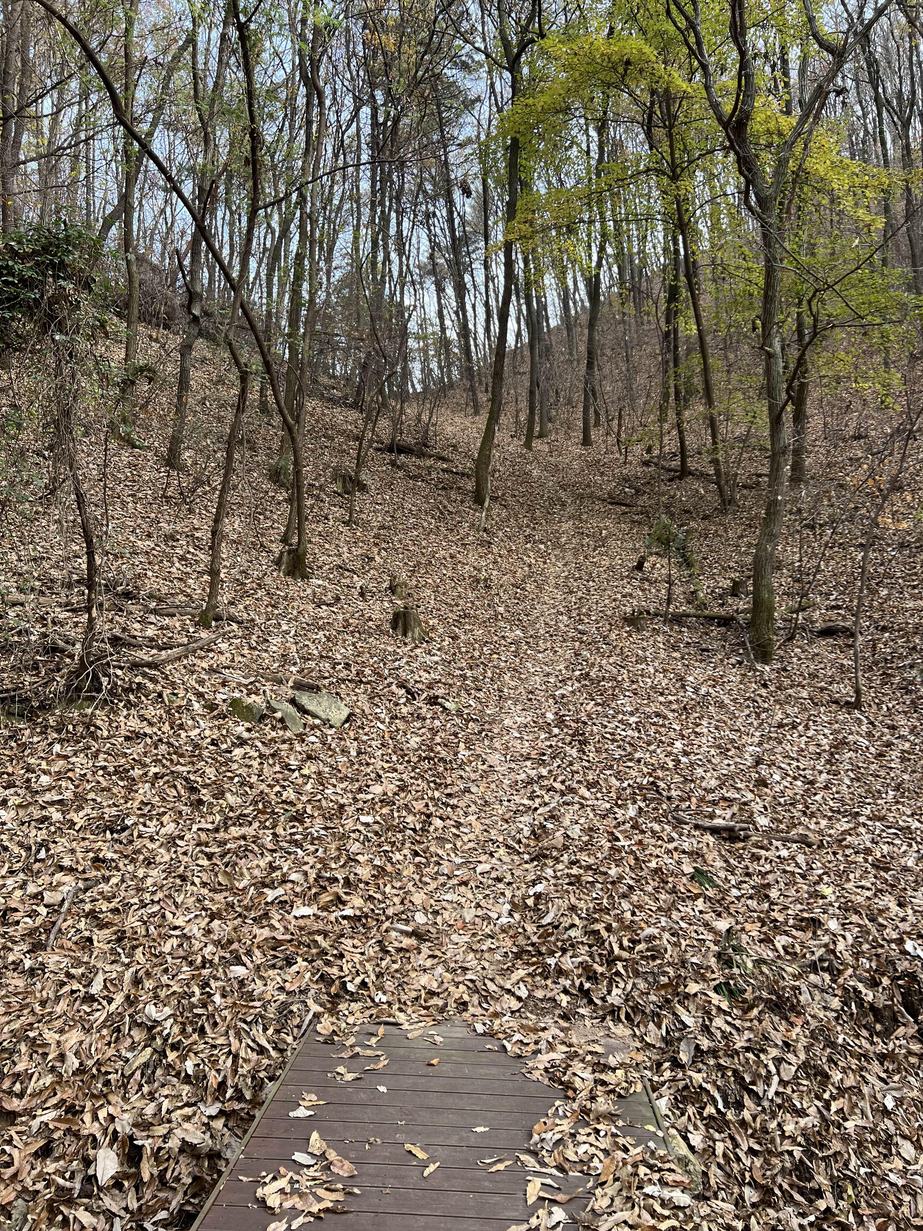 입구 10미터 정도만 오솔길이 나있고 그 담부턴 낙엽 때문에 잘 안 보인다