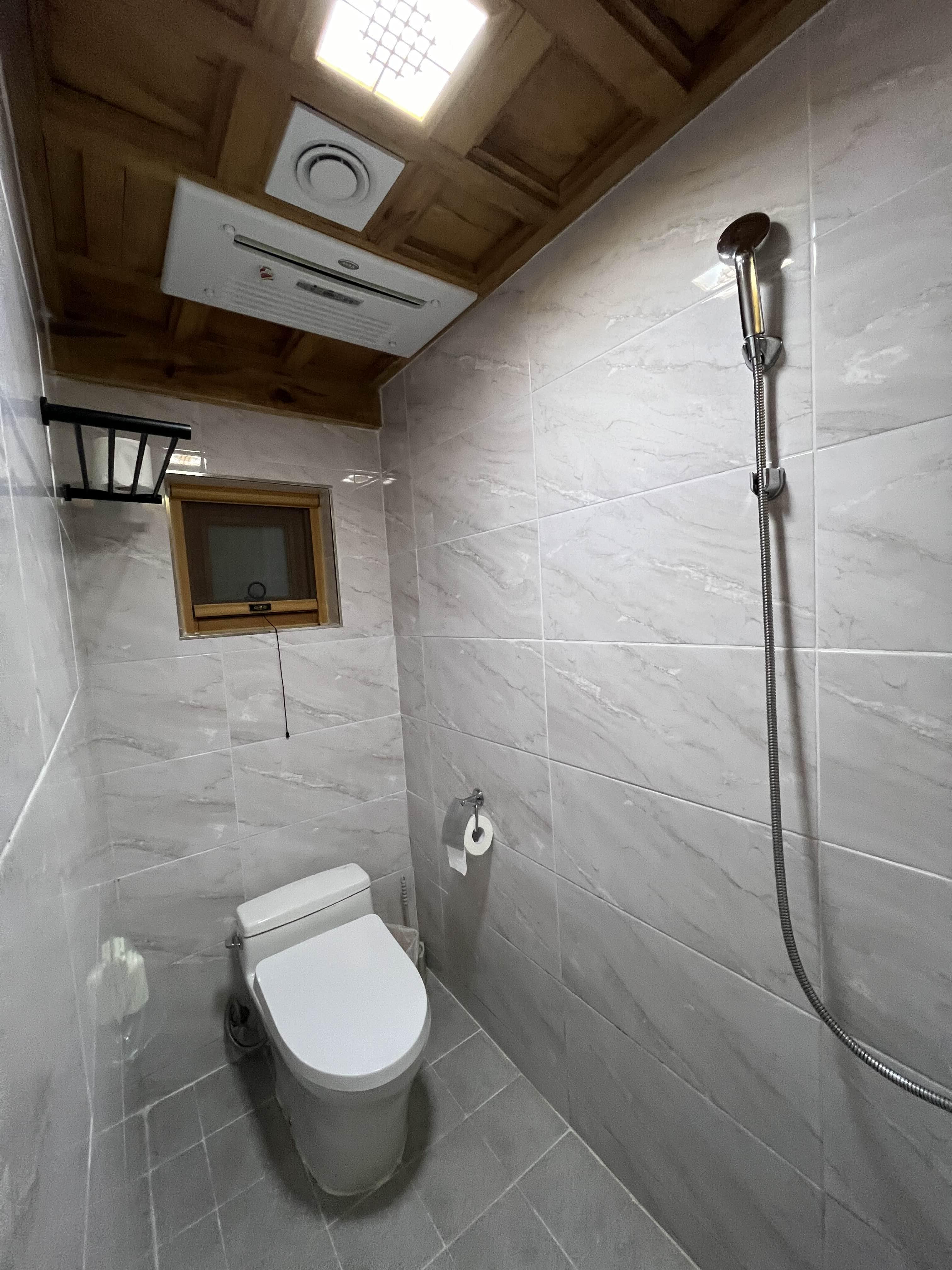 흰 벽 너머가 공용화장실이어서 객실 내 욕실이 붐비면 언제든 편리하게 사용할 수 있다