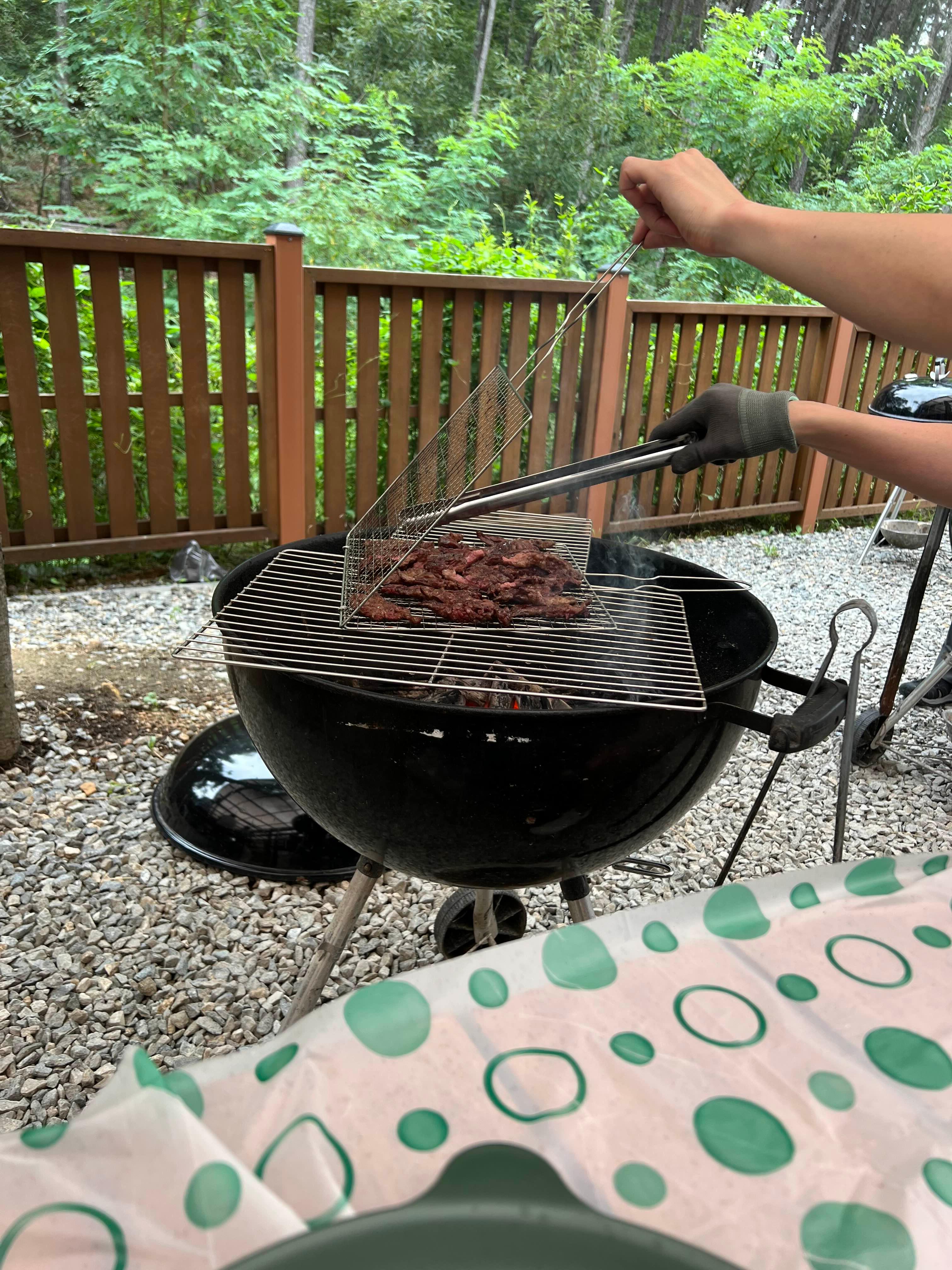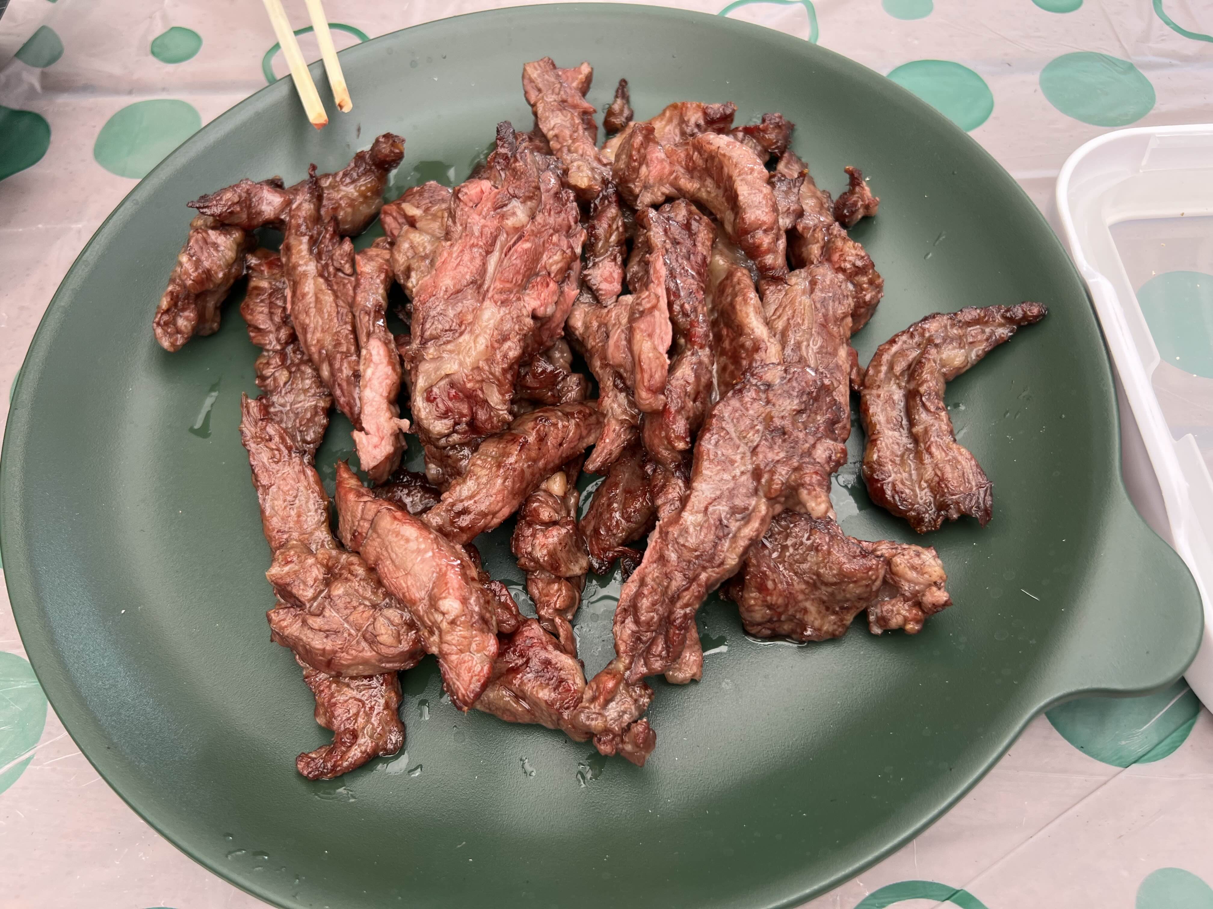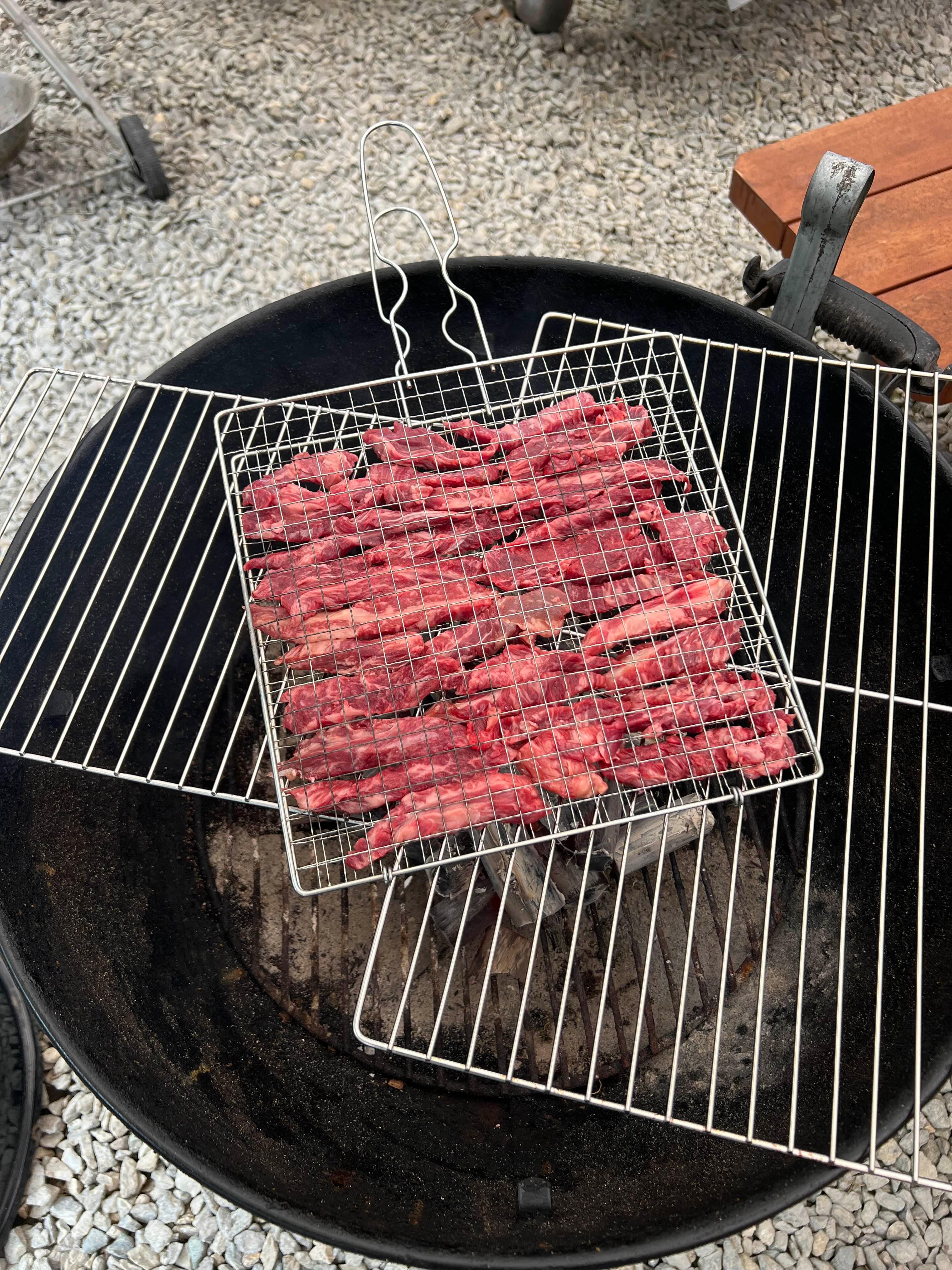 불판 두 개 잇고, 그 위에 꽃갈비살을 얹었다.