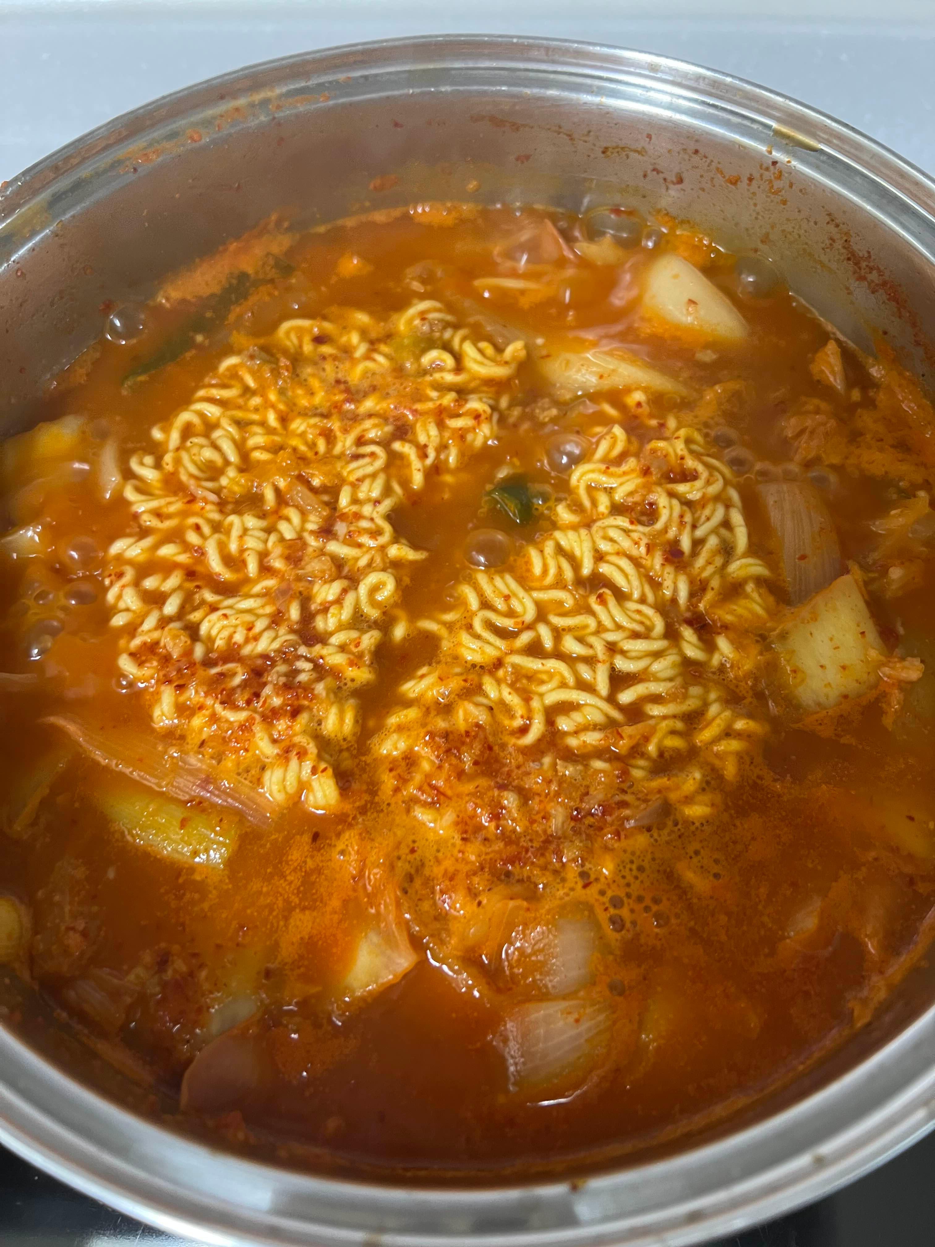 라면 사리도 맛있었고, 한식 고유의 얼큰한 국물에 치즈가 한 장 들어 가서 부드러운 국물 맛, 그리고 햄을 좋아하지 않음에도 여러 종류의 햄을 국물과 함께 먹는 맛이 좋았다. 처음부터 맛있었던 기억이 난다.