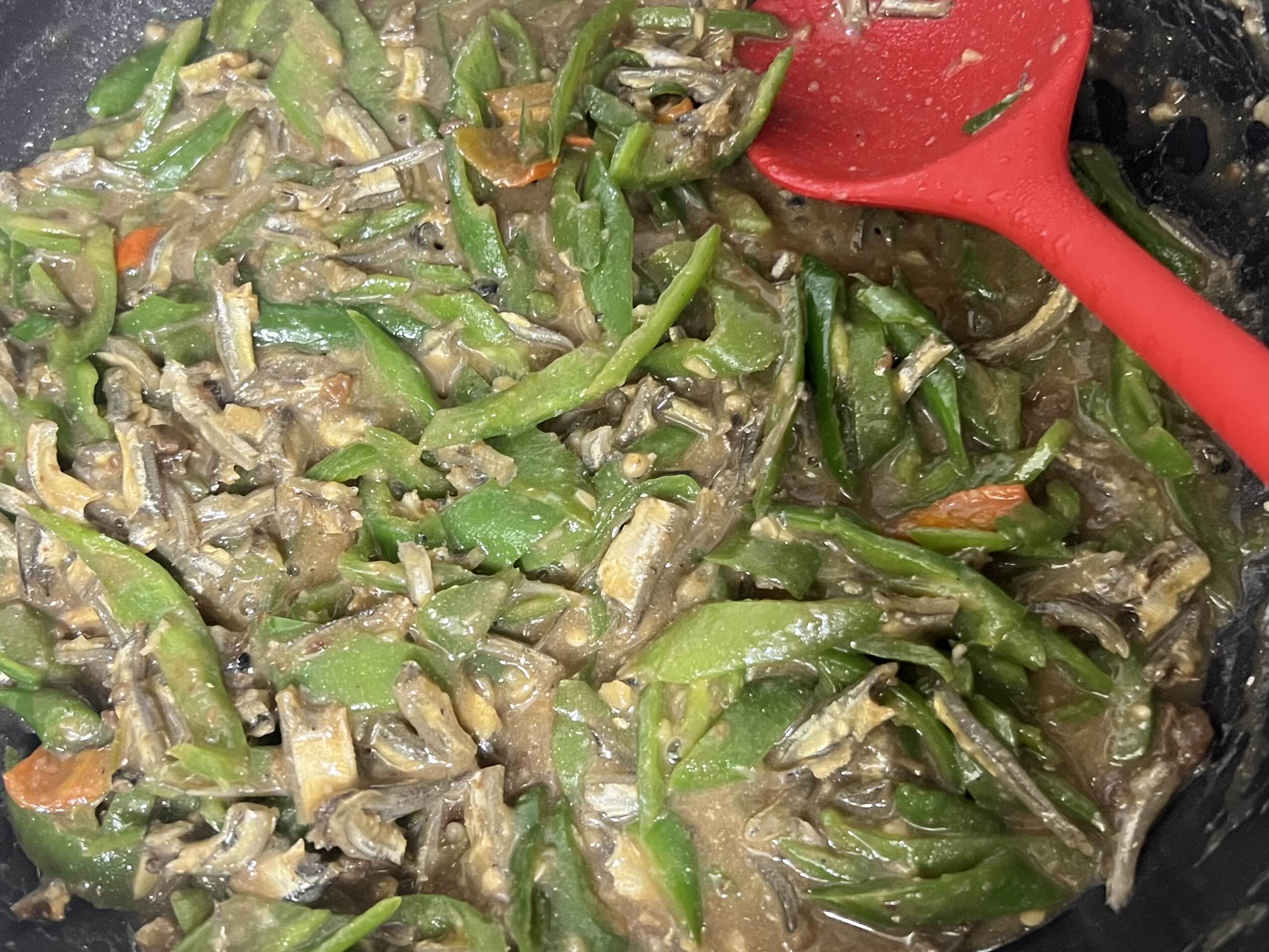 매운 것을 못 먹어서 오이맛고추, 풋고추를 주로 쓰고 10% 정도만 청양고추를 넣는다. 멸치는 국물용 멸치를 대가리와 내장을 뗀 것을 뚝뚝 잘라 써야 하는데, 이번에는 중멸치밖에 없어서 그것으로 했다. 일단 마른 팬에 좀 볶다가.