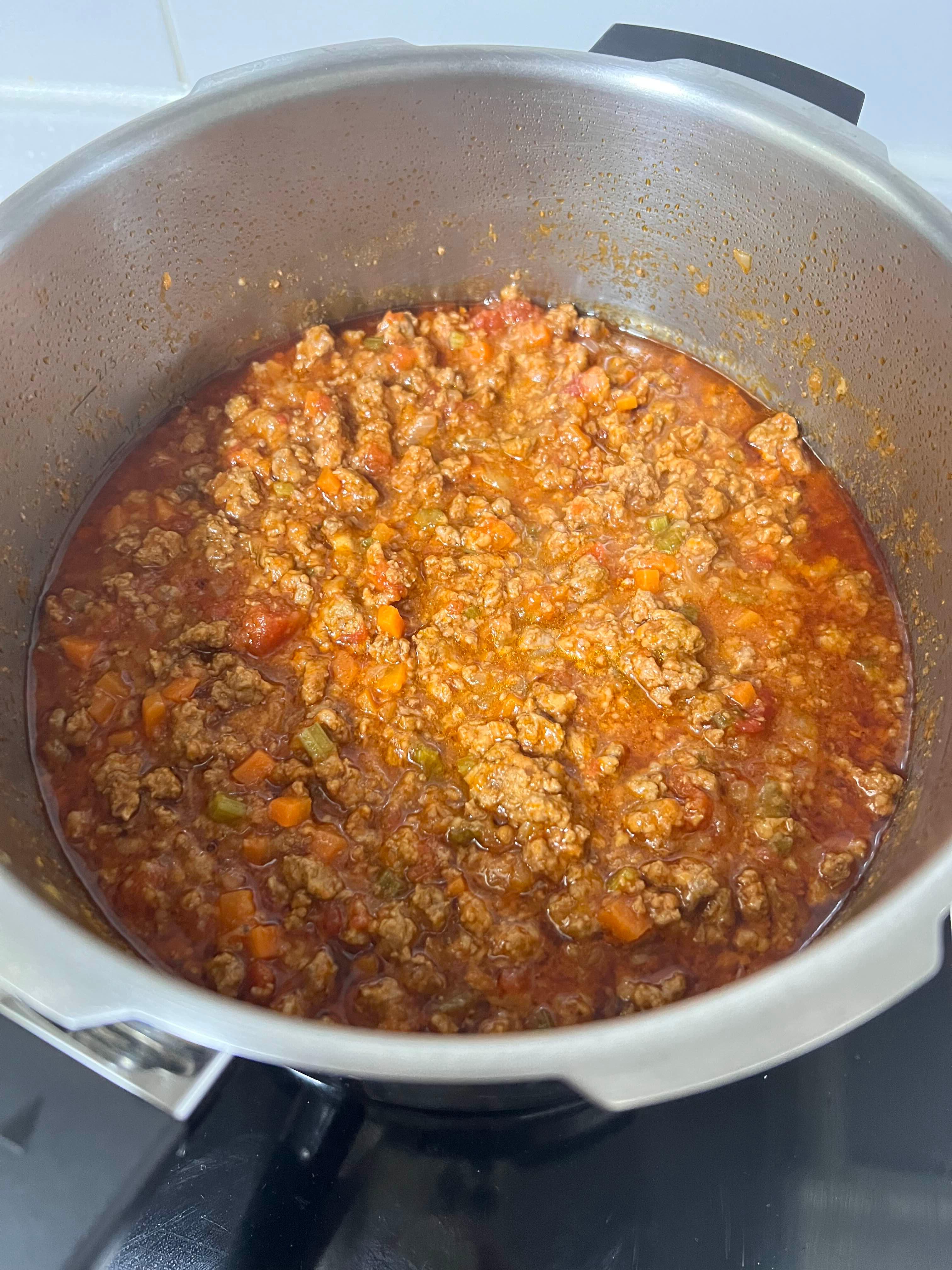 핸드 블랜더로 토마토 익은 거 다 뽀개고, 거기에 간 소고기와 샐러리 양파 등등을 넣는다.