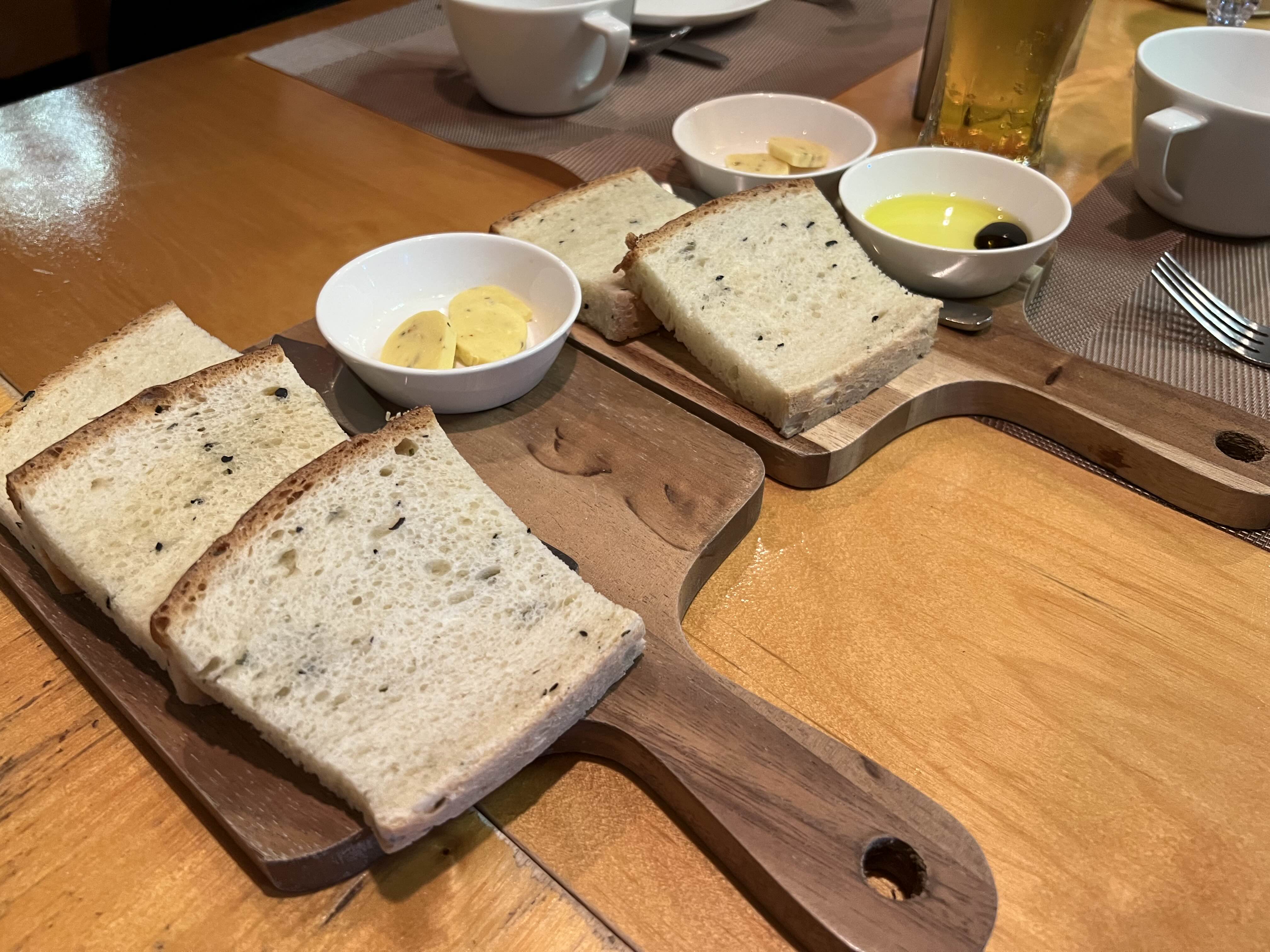 식전빵이 버터, 올리브 오일과 함께 나온다.