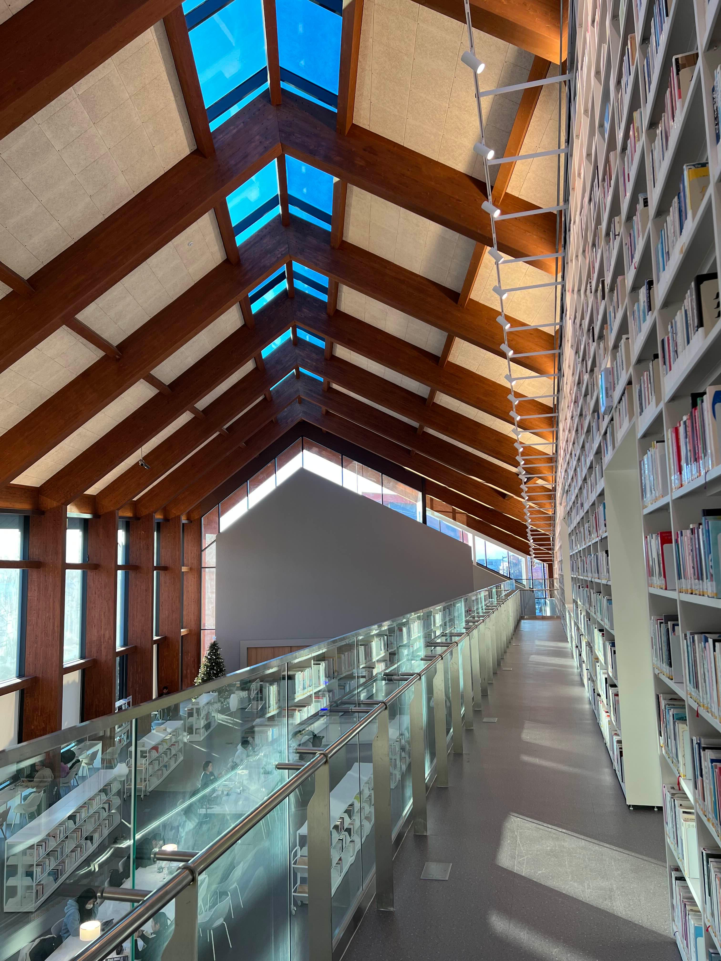 장방형 목구조, 경사진 천장, 가변형 서가 등 자유롭고 유연한 공간 요소도 요소지만